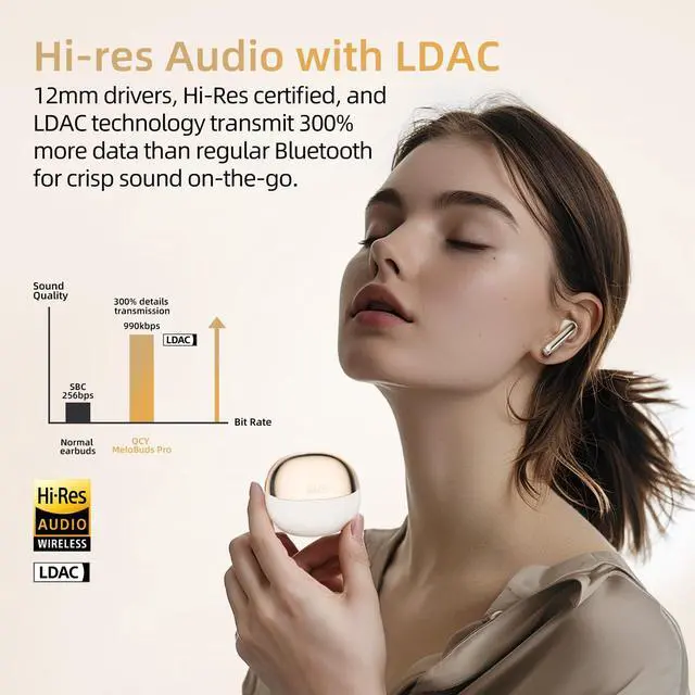 [Hi-Res Sound with LDAC] Experience true fidelity with powerful 12mm Large Bio-diaphragm driver that support LDAC and Hi-Res Audio. The MeloBuds Pro transfer 3x more detail than other Bluetooth ear buds for the highest quality in Bluetooth wireless audio. (*LDAC is only compatible with Android devices, please activate LDAC in the App settings.)