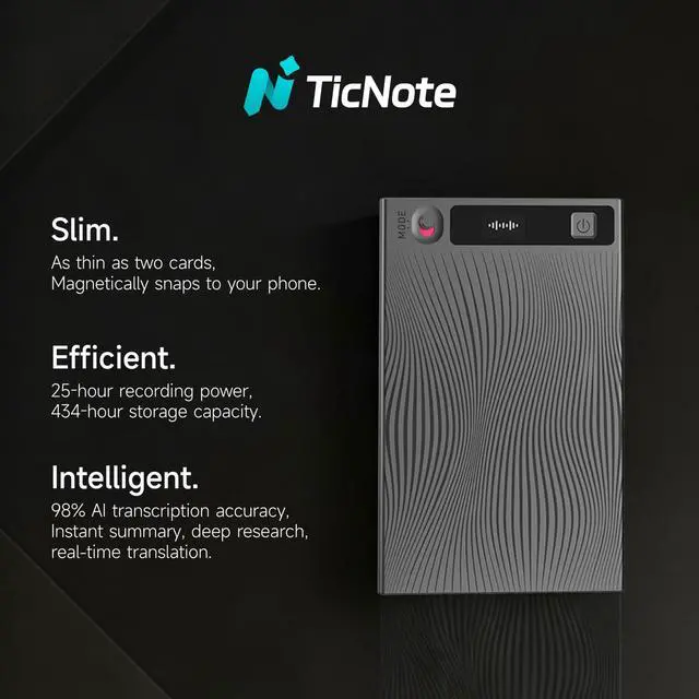 CREATIVE & CONTEXT-AWARE RECORDING TOOLS: Take photos and add notes during recordingeverything is intelligently merged into the final summary. Transform recordings into shareable AI Podcasts with voice-changing effects, or let AI identify speakers for clean, organized transcripts. ^^ LONG BATTERY LIFE & LARGE STORAGE YOU CAN RELY ON: Enjoy up to 25 hours of continuous recording and about half a month of typical use. With 64GB built-in storage (up to 434 hours), TicNote AI note taking device delivers reliable performance in an ultra-slim, credit-card-sized design weighing just 29g. ^^ ALL-IN-ONE PACKAGE & FREE AI MINUTES: Includes 1 TicNote device, 1 magnetic case, 1 metal ring, and 1 magnetic charging cable. Every user gets 600 free AI minutes per month for all Shadow AI features. Upgrade to Pro for 2, 100 minutes/month at $79/year ($ 6.58 /month).