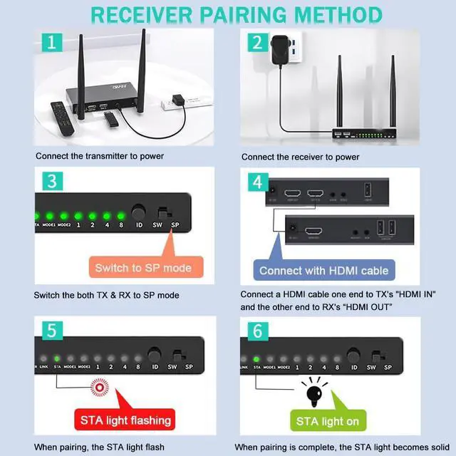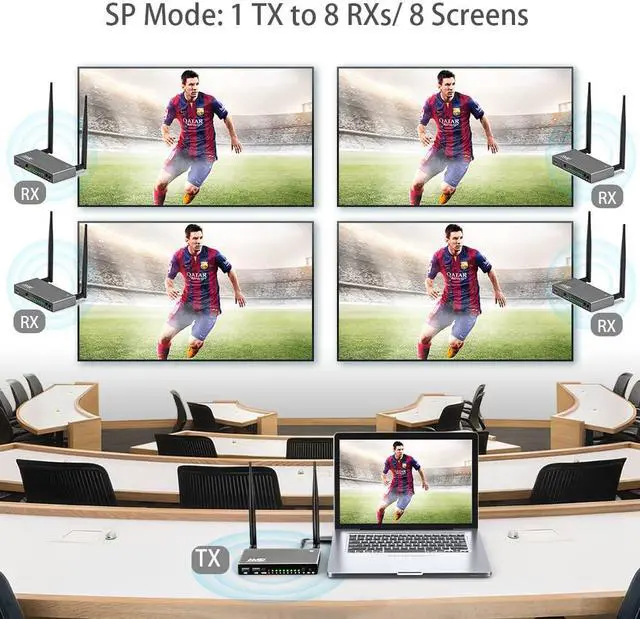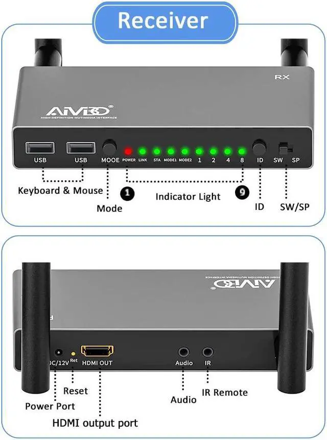 AIMIBO Wireless HDMI Receiver, 1 TX to 8 RXs, 5.8G Antenna, with KVM, IR Remote & Loop-Out Functions, 656FT/200M Long Range, Extra Receiver Need Pair with TX for First Using