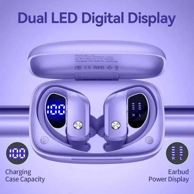 • Dual LED Displays Charging Case: Wireless earbuds with LED display make it obvious to show the battery power of the case and ear buds. The remaining power in percentage on the screen is shown to the left of the bluetooth headphones. The right side is assigning to a charging process of each bud, there are separated power consumption indicators by 4 grids in total, each grid represents 25% power of bud. During Charging, the LED indicator light will flash.