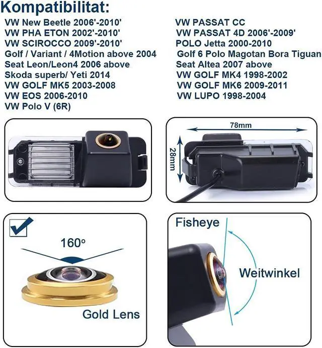 Dear customer, Please must check the camera size and appearance before place a order, see if can fit your car license plate lamp place size and appearance! Because the same car model in different countries may have some difference, please check the camera size and compare the installation of your car carefully to avoid mistake. This product could fit for all below models as expected: Replacement for VW New Beetle 2006, -2010; PHAETON 2002, -2010; SCIROCCO 2009, -2010; Golf/ Variant / 4Motion above 2004; Seat Leon/Leon4 2006 above; Skoda superb / Yeti 2014; GOLF MK5 2003-2008; EOS 2006-2010; Polo V (6R); PASSAT CC; PASSAT 4D 2006, -2009; POLO Jetta 2000-2010; Golf6 Polo Magotan TiguanSeat Altea 2007 above; GOLF MK4 1998-2002; GOLF MK6 2009-2011; LUPO 1998-2004 -