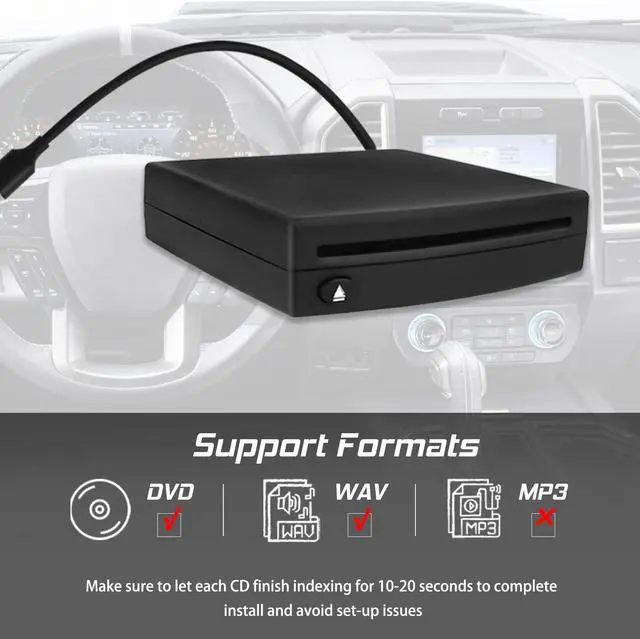 Installation: Unit has a single cable installation. CD player can be mounted both vertical or horizontal - under the car seat or under the dash or in any other accessible location, but not upside down or past the zero-degree vertical angle. Compatible Formats are. WMA or. WAV, but not