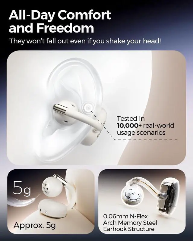 All-Day Comfort & Unplugged AwarenessExperience audio freedom without compromise. Our ultra-lightweight (only 5g per earbud) clip-ons, crafted with a soft liquid silicone and flexible N-Flex arch, offer a secure, forget-its-there fit for all ear shapeseven with glasses or helmets. The open-ear design keeps you safely aware of your surroundings like traffic and conversations, perfect for workouts, commutes, and work. ^^ Smart AutoSense & Seamless ControlEnjoy intelligence that adapts to you. Smart AutoSense automatically detects left/right wearing for instant, correct stereo sound. Built-in sensors pause playback when you remove an earbud and resume when you put it back on.
