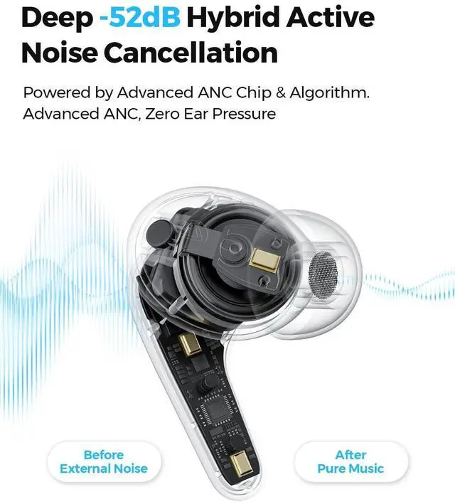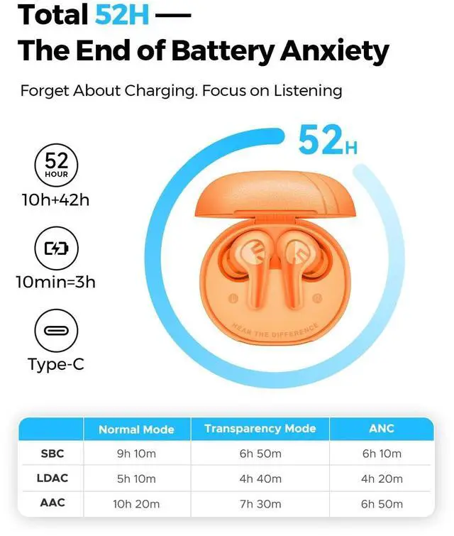 Advanced Hybrid Active Noise Cancelling adapts to your environment, letting you focus on music, workouts, or calls without distraction. ^^ HI-RES & LDAC CERTIFIED SOUND WITH PEATSAUDIO APPEnjoy studio-grade, lossless audio with Hi-Res + LDAC dual certification. The 12mm PU+Titanium driver delivers deep bass, clear mids, and sparkling highs. Customize touch controls, switch ANC modes, and explore 10+ EQ presets with the PeatsAudio app for a personalized audio experience. ^^ LONG BATTERY, BLUETOOTH 6.0 & CLEAR CALLSUp to 52H total playtime (10H earbuds + 42H case) with fast charging.