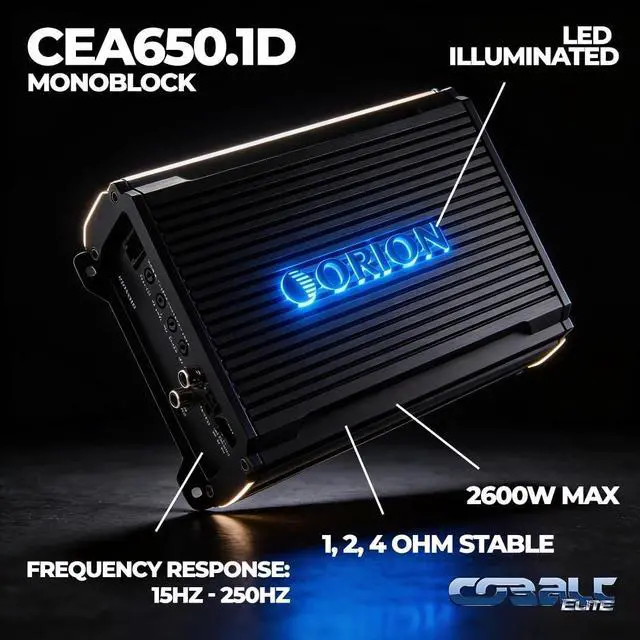 ORION COBALT ELITE MONOBLOCK AMPLIFIER: The Orion CEA 650.1D is a Class-D monoblock amplifier engineered to deliver reliable subwoofer power with high efficiency. Producing up to 650 watts RMS, this amplifier is designed for clean, controlled low-frequency output in daily driver and custom car audio systems. ^^ STABLE 1-OHM