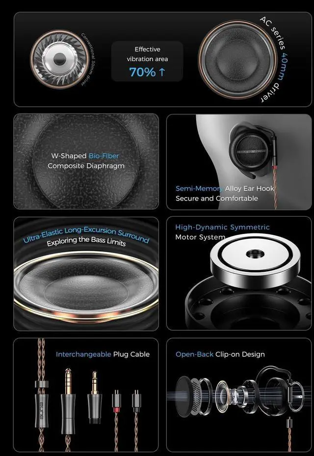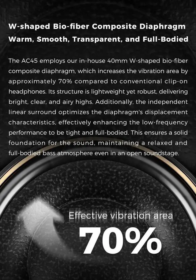 The AC45 redefines the acoustic potential of clip-on open headphones. Its large W-shaped biofiber composite diaphragm, independent linear surround system, and high-dynamic symmetric motor work in synergy structurally breaking through the inherent limitations of clip-on headphones in mid-low frequency performance. Within its compact, open-design body, it delivers exceptional sound balance and dynamic expression ^^ [W-shaped Bio-fiber Composite DiaphragmWarm, Smooth, Transparent, and Full-Bodied] The AC45 employs our in-house 40mm W-shaped bio-fiber composite diaphragm, which increases the vibration area by approximately 70% compared to conventional clip-on headphones. Its structure is lightweight yet robust, delivering bright, clear, and airy highs.