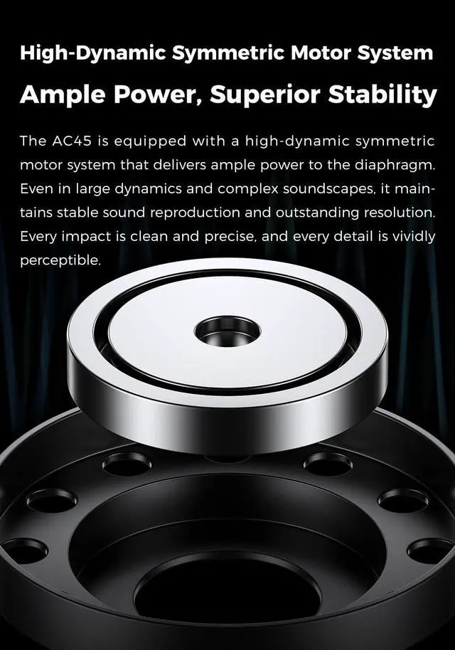 Even in an open soundstage, it maintains a warm and full-bodied bass atmosphere ^^ [High-Dynamic Symmetric Motor SystemAmple Power, Superior Stability] The AC45 is equipped with a high-dynamic symmetric motor system that delivers ample power to the diaphragm. Even in large dynamics and complex soundscapes, it maintains stable sound reproduction and outstanding resolution. Every impact is clean and precise, and every detail is vividly perceptible ^^ [Open-Back Clip-on DesignA More Transparent, Expansive and Immersive Soundstage] The pure open-back, clip-on design allows sound waves to diffuse naturally, resulting in a free, spacious sound-stage and natural, realistic imaging.