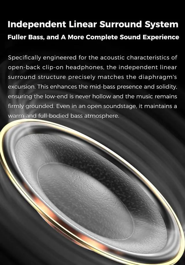 Additionally, the independent linear surround optimizes the diaphragm's displacement characteristics, effectively enhancing the low-frequency performance to be tight and full-bodied. This ensures a solid foundation for the sound, maintaining a relaxed and full-bodied bass atmosphere even in an open soundstage ^^ [Independent Linear Surround SystemFuller Bass, and A More Complete Sound Experience] Specifically engineered for the acoustic characteristics of open-back clip-on headphones, the independent linear surround structure precisely matches the diaphragm's excursion. This enhances the mid-bass presence and solidity, ensuring the low-end is never hollow and the music remains firmly grounded.