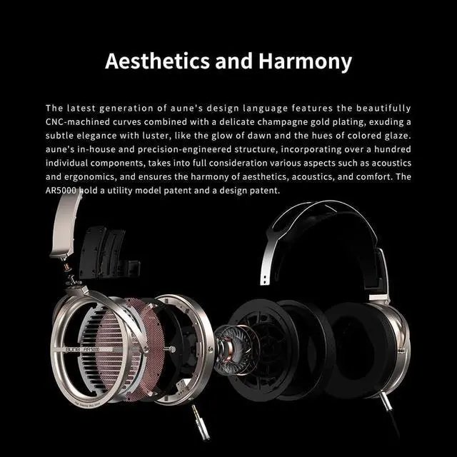 Portable devices with high quality, such as the Yuki, are already capable of driving the headphones to deliver impressive overall performance. Furthermore, when paired with desktop equipment, the AR5000 will unlock their surprisingly high potential, opening up endless possibilities. Aesthetics and Harmony The latest generation of aune's design language features the beautifully CNC-machined curves combined with a delicate champagne gold plating, exuding a subtle elegance with luster, like the glow of dawn and the hues of colored glaze. aune's in-house and precision-engineered structure, incorporating over a hundred individual components, takes into full consideration various aspects such as acoustics and ergonomics, and ensures the harmony of aesthetics. acoustics, and comfort. The AR5000 hold a utility model patent and a design patent. So Comfortable That You Will Forget About Them The innovative Concentric Circle Wearing System, combined with an overall lightweight design, achieves an excellent wearing experience. The headband size and overall curvature are finely adjusted to the millimeter level, ensuring a perfect fit for any head shape and eliminating any feeling of pressure or foreign objects. The earcup is made of breathable acoustic slow-rebound sponge and designed to fully cover the ears, allowing for extended listening sessions without any discomfort.