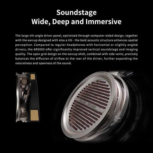 Soundstage: Wide, Deep and Immersive The large-tilt-angle driver panel and the ear pad designed with also a tilt - the special acoustic structure enhances spatial perception. Compared to regular headphones with horizontal or slightly angled drivers, the AR5000 offer significantly improved vertical soundstage and imaging. The open grid design on the earcup shell with side vents precisely balances the diffusion of airflow at the rear, further expanding the naturalness and openness of the sound. Powerful and Deep Bass, Grand and Majestic Presence The newly designed acoustic suspension and airflow system enhance the linearity of diaphragm movement and balance the internal pressure and sound velocity within the transducer, resulting in deep and powerful bass and a composed and dynamic performance. Whether it's the exhilarating symphony or the thunderous roar, the AR5000 can effortlessly present the grandeur and intensity. Detachable Cable Design The 3.5 mm TRS detachable cable design and the universal interface that meets the definition of most upgrade cables on the market, allow for easy use of various types of cables and provide great versatility. Effortlessly Driven by All Devices, A World of Surprises to Unlock The low impedance design of 28 ohms improves the compatibility of full-sized headphones.