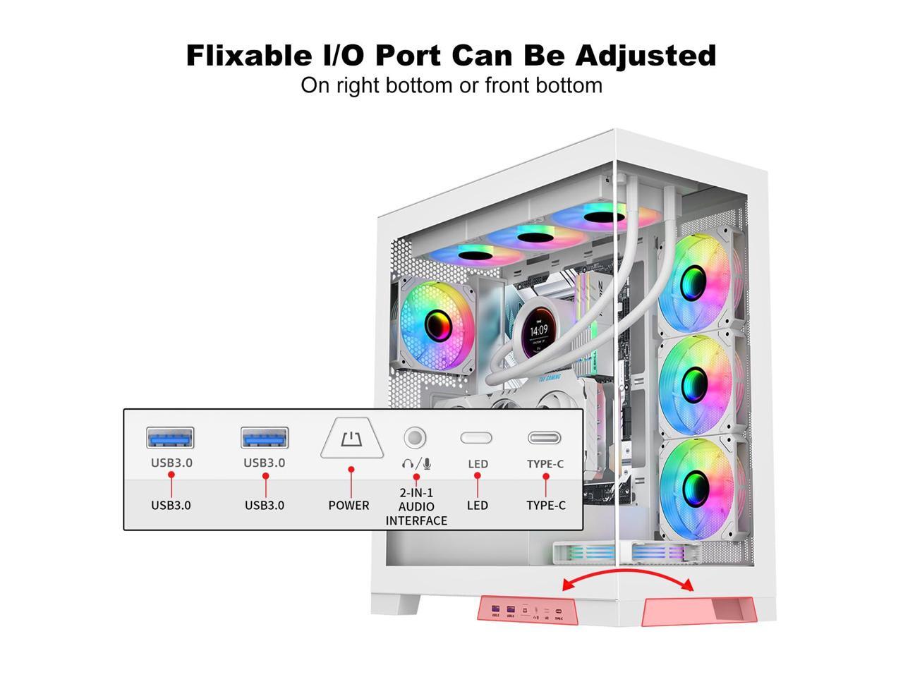 Equipped with ARGB pre-installed fans, this mid tower pc case includes 4×120mm ARGB PWM fans and a 4-port fan hub, offering dynamic lighting and improved airflow right out of the box. The integrated hub allows for synced RGB control via your motherboard software. This setup ensures silent yet efficient cooling performance, ideal for creating a vibrant type-c computer case layout for your rig.
