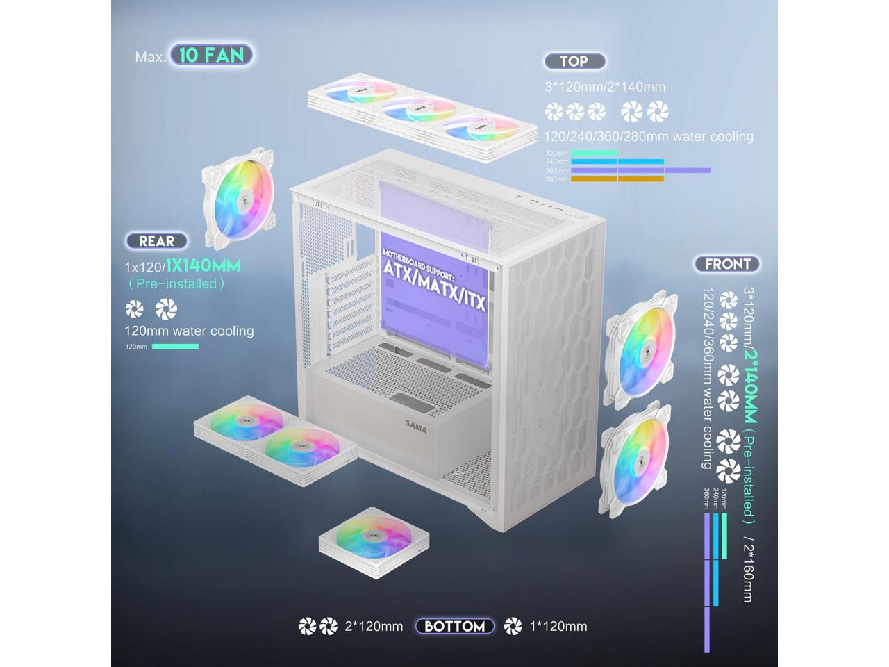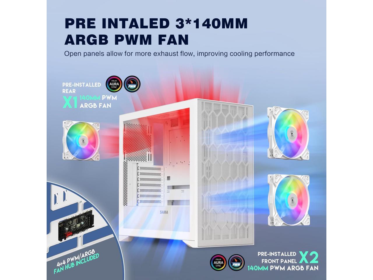 - Premium Mesh Design & Dust Control The SAMA V Mesh ATX PC Case features a high-airflow mid tower pc case design with a meticulously engineered mesh front panel, acting as a dual-layer dust filter for easy cleaning. Pre-installed 3 x 140mm ARGB PWM fans (2 front + 1 rear) ensure maximum cooling, while magnetic dust filters on the top and bottom further reduce debris. Showcase your rigs RGB lighting through the tempered glass side panelperfect for case pc gaming enthusiasts.