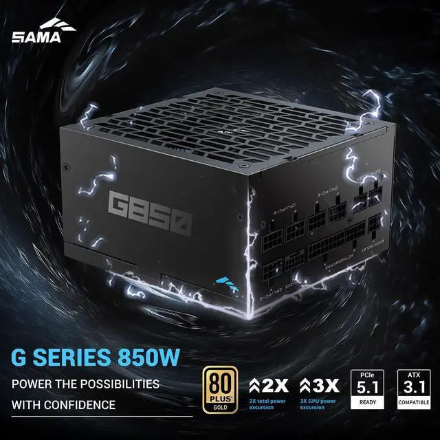 SAMA G850 850W Full Modular Power Supply 80 Plus Gold Certified ^^ ATX 3.1 & PCIe 5.1 Ready ^^ 12V-2x6 GPU Power, Fanless ECO Mode, Fully Modular, Japanese Capacitors Compact PSU Black