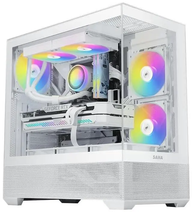 Panoramic Tempered Glass Design: Showcase your build with dual tempered glass panels offering a breathtaking 270 view of your RGB-lit components. The SAMA V40 ATX PC case is perfect for enthusiasts who want to display their custom PC setup in style, while the dual-chamber layout enhances airflow and organization. ^^ Spacious Interior for
