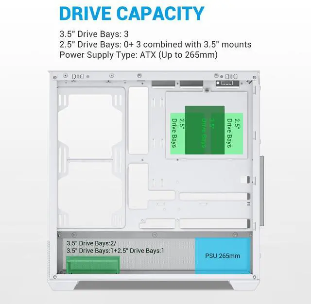 USB Type-C: Equipped with a USB 3.1 Type-C port, 2 USB 3.0 ports, and HD audio, the SAMA V40 ATX PC case ensures fast data transfer and easy access to peripherals. Its flexible storage options accommodate up to 3 HDDs or 3 SSDs, making it a versatile choice for gaming and productivity builds.