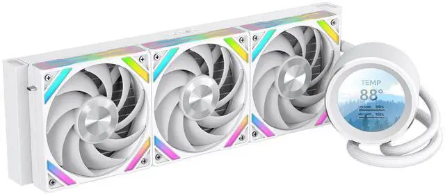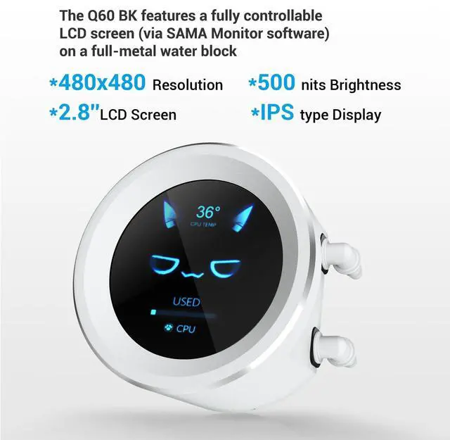 Immersive 2.8" LCD Display with Advanced Customization Elevate your build with the SAMA Q60 cpu cooler, featuring a stunning 2.8 IPS LCD screen with 480480 resolution and 500 nits brightness. This high-contrast, full-color display offers clear visibility at any angle and can be fully customized via SAMA Monitor software to show real-time system stats, custom images, or videosmaking this sama 360mm aio lcd a true centerpiece of your gaming rig. ^^ High-Performance Fans with Silent Fluid Dynamic Bearings The Q60 includes three pre-installed XT120 fans with LCP (Liquid Crystal Polymer) blades designed for enhanced strength and airflow.