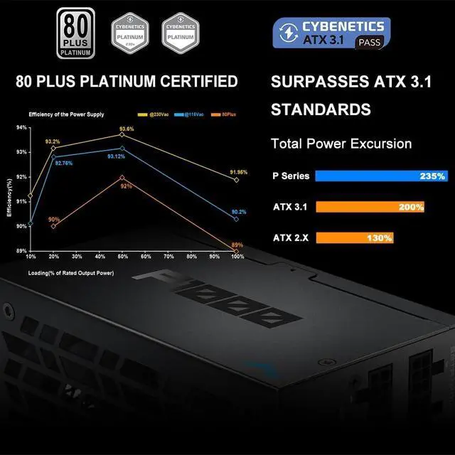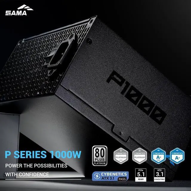 Platinum Efficiency & Modular FreedomThe SAMA P1000 power supply combines 80 PLUS & Cybenetics Platinum efficiency with fully modular flat black braided cables, reducing clutter and maximizing airflow for clean, efficient builds. ^^ Handles Power Spikes with ATX 3.1 ComplianceDesigned to exceed ATX 3.1 standards, this power supply supports two hundred percent power excursions at one hundred microseconds, providing reliable stability for PCIe 5.1 graphics cards and high-end processors under sudden loads. ^^ Quiet OperationP1000 got LAMBDA A+ noise rating, equipped with the fluid dynamic bearing fan remains off under light loads below sixty percent and ramps up smoothly with a noise-optimized curve, ideal for silent PC builds without sacrificing cooling.