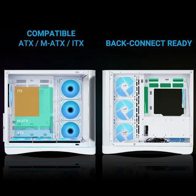 7 Pre-Installed ARGB Fans - Includes 1x rear 120mm + 6x reverse PWM fans (bottom/side) for optimal airflow and stunning lighting effects. ^^ Back-Connect Motherboard Ready - Designed for easy cable management with 45.8 mm clearance, compatible with back-connect ATX/M-ATX boards. ^^ Dual Tempered Glass Panels - Full-view tempered glass on front and side panels to showcase your build, made with 4.0 mm thick glass. ^^ High Compatibility - Fits up to 445mm GPUs, 160mm CPU coolers, and supports 360mm radiators for custom liquid cooling. ^^ Modern I/O Panel - Features USB 3.1 Type-C, dual USB 3.0, and audio/mic ports for convenient connectivity.