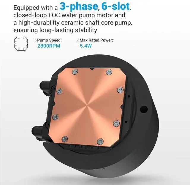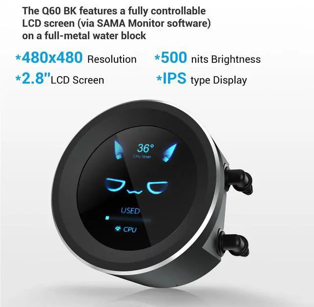 Immersive 2.8" LCD Display with Advanced Customization Elevate your build with the SAMA Q60 cpu cooler, featuring a stunning 2.8 IPS LCD screen with 480480 resolution and 500 nits brightness. This high-contrast, full-color display offers clear visibility at any angle and can be fully customized via SAMA Monitor software to show real-time system stats, custom images, or videosmaking this sama 360mm aio lcd a true centerpiece of your gaming rig. ^^ High-Performance Fans with Silent Fluid Dynamic Bearings The Q60 includes three pre-installed XT120 fans with LCP (Liquid Crystal Polymer) blades designed for enhanced strength and airflow.