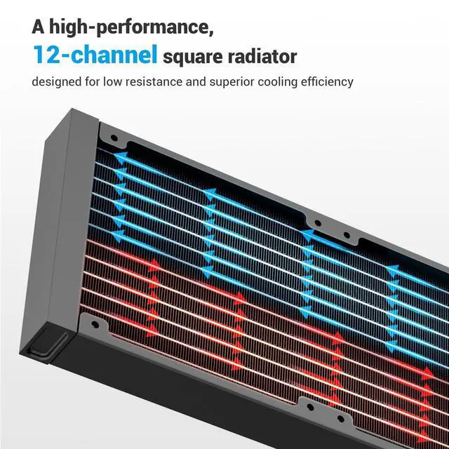 These fans operate at 5002600 RPM 10%, deliver airflow up to 86 CFM and static pressure of 3.7 mmHOall while keeping noise under 35 dB-A. With Type-C daisy-chaining and Fluid Dynamic Bearings, this aio cooler delivers efficient thermal management with minimal cable clutter and ultra-quiet performance. ^^ Ultra-Efficient 397mm Radiator for Superior Heat Dissipation The oversized 397 120 27mm aluminum radiator, paired with 20mm thick water channels, ensures exceptional heat transfer for demanding workloads. Whether you're gaming, streaming, or rendering, this aio cooler 360mm setup maintains low CPU temps even under peak loadsmaking the SAMA Q60 cpu cooler a powerhouse choice for performance-driven systems.