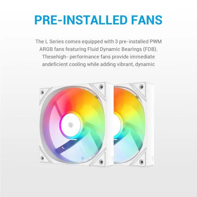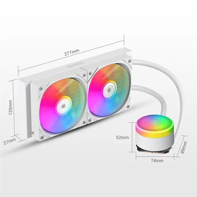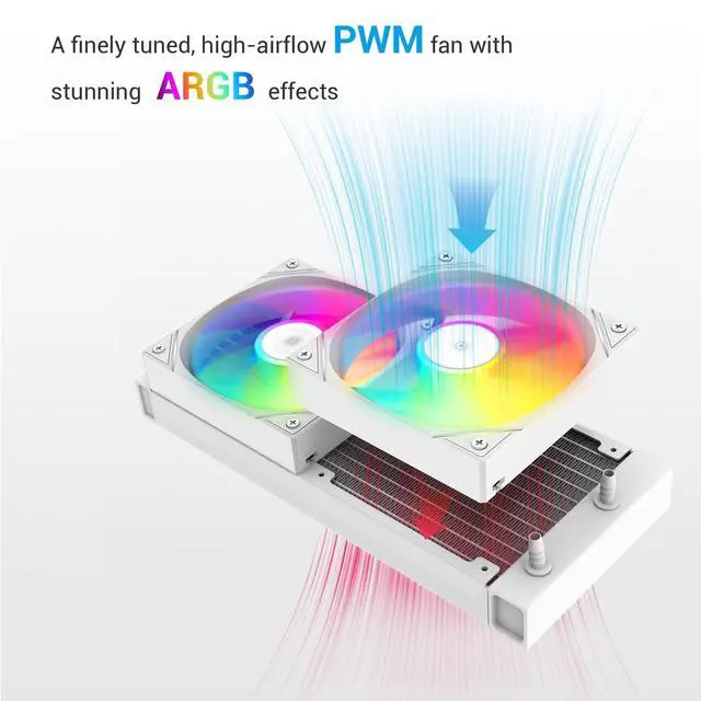 High-Performance PCs: The SAMA L40 240mm AIO liquid cooler delivers exceptional heat dissipation with its 27mm-thick aluminum radiator and 380mm tubes, perfect for intense gaming and overclocking. The 1.5 mm thick copper base and 20mm internal water channels ensure rapid thermal transfer, keeping your CPU cool even under heavy workloads. ^^ Vibrant ARGB Lighting & High-Airflow Fans: Featuring dual 120mm ARGB fans (800200010% RPM), this 240mm liquid cooler pushes 83 CFM airflow with 2.6 mmHO static pressure, all while operating at a quiet 34.8 dB-A. Customize your build with 4-Pin PWM control and dazzling addressable RGB effects. ^^ Whisper-Quiet Pump for