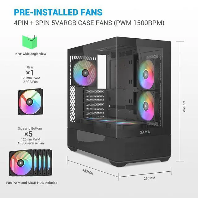 ARGB PWM Fans: The SAMA V40 mid tower ATX case comes pre-installed with 6 high-performance 120mm ARGB PWM fans (3 bottom, 2 side, 1 rear) and supports 360mm water cooling on top, delivering exceptional heat dissipation and stunning lighting effects. With support for up to 9 fans, this mid tower PC case ensures your high-performance system stays cool even under heavy loads. ^^ 270