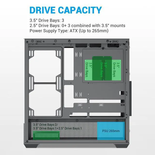 USB Type-C: Equipped with a USB 3.1 Type-C port, 2 USB 3.0 ports, and HD audio, the SAMA V40 ATX PC case ensures fast data transfer and easy access to peripherals. Its flexible storage options accommodate up to 3 HDDs or 3 SSDs, making it a versatile choice for gaming and productivity builds.