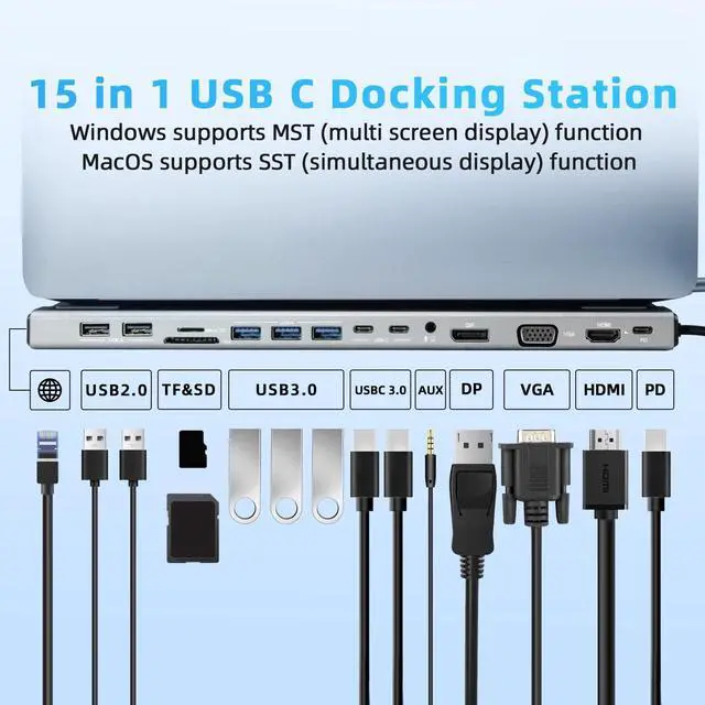 ^^ High-Resolution Display Support: Enjoy crisp and clear visuals with support for maximum resolutions of 4K@60Hz for HDMI and DP interfaces, and 1080P@60Hz for VGA. This docking station supports simultaneous output of HDMI, DP, and VGA interfaces, Windows supports MST (multi screen display) function, while MacOS supports SST (simultaneous display) function.