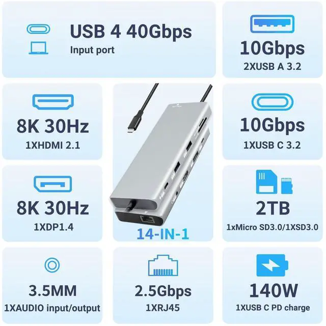 The UC-U4 is a next-generation USB 4.0 docking station engineered for power users who demand more from their laptops. With 10 essential ports packed into a sleek, compact design, it transforms a single USB-C connection into a full workstationperfect for professionals, creators, and multitaskers. Expand your screen real estate with HDMI 2.1 and DP 1.4, supporting crystal-clear 8K@30Hz on a single display or dual 4K@60Hz for ultimate productivity. Transfer files in seconds with two USB-A 3.2 Gen2 and one USB-C 3.2 Gen2 port, all delivering blazing 10Gbps speeds. Keep your devices charged and ready with up to 140W power delivery via PD 3.1 perfect for high-performance laptops and accessories.