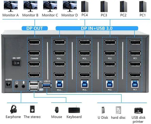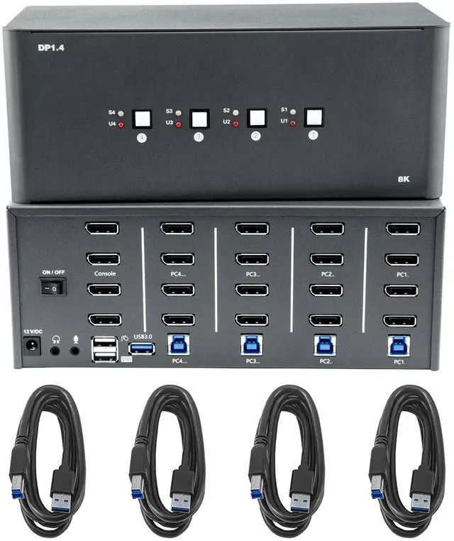 DisplayPort KVM Switch: Share an HDTV or DisplayPort monitor, USB keyboard, and mouse between up to four USB/DisplayPort-enabled computers and devices. ^^ USB 3.0