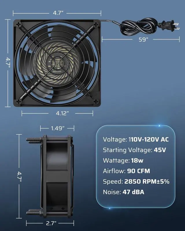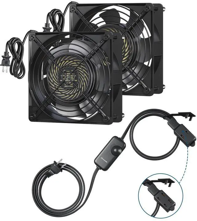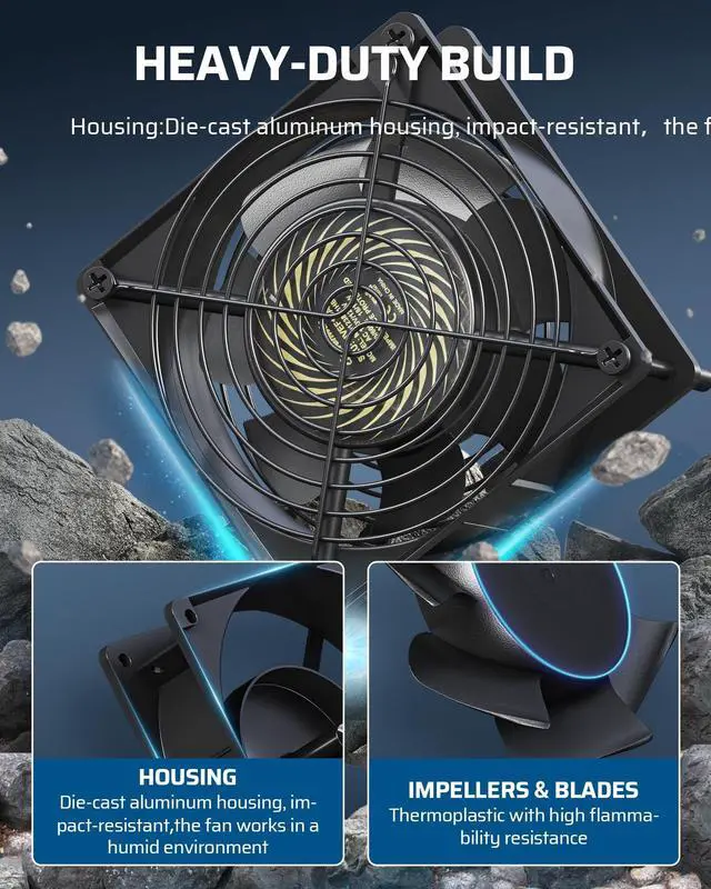 [Versatile Application] Ideal for wide use, this 120mm exhaust fan excels in cooling, and ventilation, as a 120mm fan replacement for spaces like growing rooms, chicken coops, garages, bathrooms, and basements; it quickly dispels odor and moisture, maintaining air circulation ^^ [Adjustable Fan Speed] Featuring a 3-in-1 socket, one fan controller allows you to control up to three fans simultaneously; adjust the ventilation fan speed from 40% to 100%, optimizing airflow and minimizing noise for the perfect ventilation solution in any setting ^^ [Durable & Flame-Resistant] With a robust die-cast aluminum shell and impeller blades made from flame-resistant thermoplastic, this exhaust fan 120v is built to last; 5ft speed controller cord allows you to position the fan for optimal airflow without being constrained by cord length ^^ [High Performance] UL-certified for safety and reliability, this cooling fan is equipped with dual ball bearings, delivering an impressive lifespan of up to 50, 000 hours; 90CFM high airflow for superior air circulation and cooling (can be used flat or upright) ^^ [Upgraded Waterproof] Unlike other fans, our 120v fan is engineered to withstand high-humidity environments, featuring a rust-proof and waterproof body; ideal for wet environments (note: avoid getting the speed controller and plug wet)
