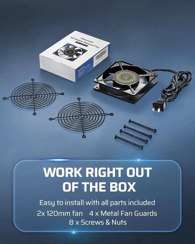 [Wide Application] Perfect for cooling, ventilation needs, or as a replacement 120v fan for various products; the fan comes fully assembled with a heavy-duty aluminum housing, power cord, two metal fan guards, and installation screws ^^ [Durable Build] Crafted from rugged die-cast aluminum, the housing ensures long-lasting performance even in harsh environments; our cooling fan blades are made from thermoplastic, offering excellent flame resistance ^^ [Reliable Performance] UL certified with dual ball bearings, this 120mm exhaust fan offers an impressive lifespan of up to 50, 000 hours; it can be used both horizontally and vertically for maximum versatility in the airflow direction ^^ [Upgraded Waterproofing] Designed to perform in high-humidity environments, the 120mm fans body is rust-proof and waterproof; ideal product for use in greenhouses, grow rooms, chicken coops, garages, and other moist settings ^^ [Safety First] Equipped with metal fan guards on both sides, this DIY fan prevents children, pets, or other small objects from getting inside while in operation; enjoy peace of mind while using this fan in your home or workspace