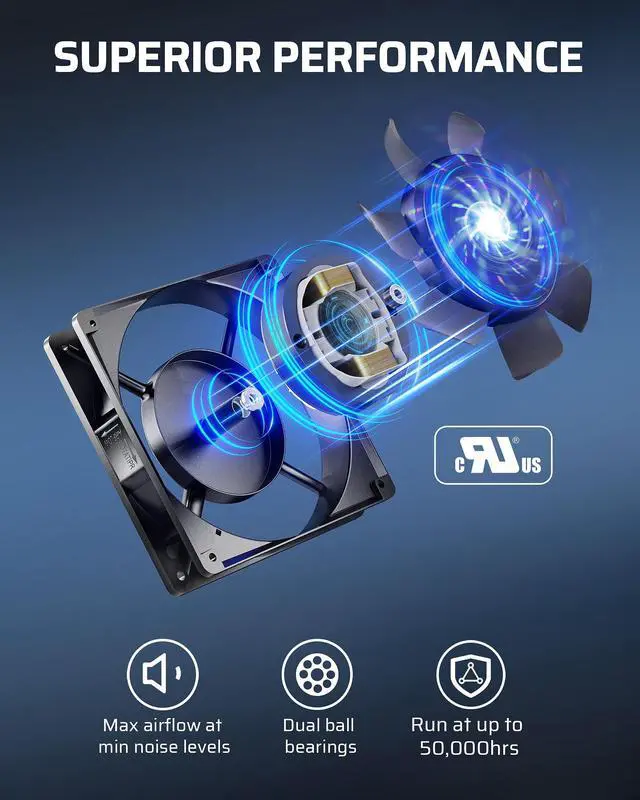 • [Reliable Performance] UL certified with dual ball bearings, this 120mm exhaust fan offers an impressive lifespan of up to 50,000 hours; it can be used both horizontally and vertically for maximum versatility in the airflow direction