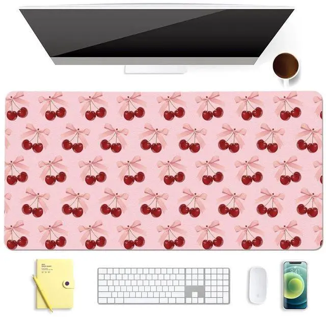 BlHMCASE Cute Bow Cherry Pink Extended Gaming Keyboard Mouse Pad, Non-Slip Leather Home Office Desk Mat Protector, Laptop Desk Pad Writing Pad