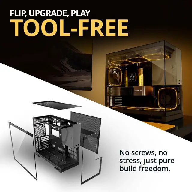 Tool-Free Tempered Glass Panels: Quick-access side panels with a screwless design make upgrades fast and hassle-free. Strong, clear tempered glass puts your build on display.