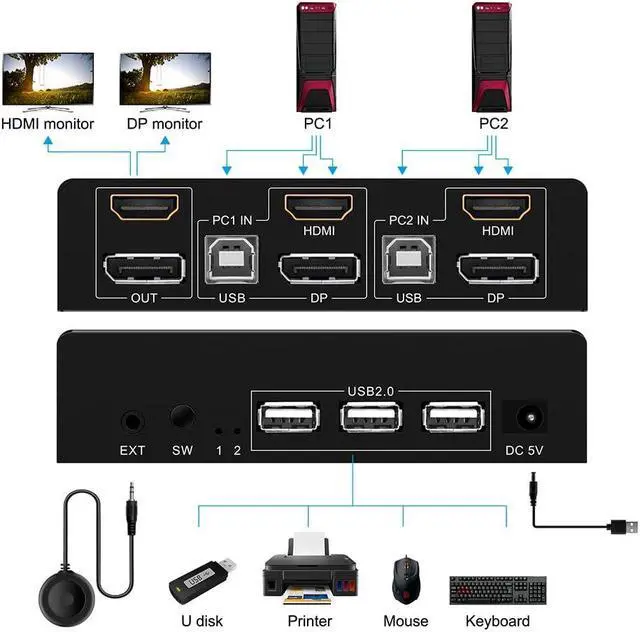 2. This KVM switch requires HDMI+DP input for each computer However, most computers, especially laptops, do not have HDMl+DP outputs, SO non-HDMI+DP outputs (such as VGA, DVI, USB C) require a reliable adapter or docking station.