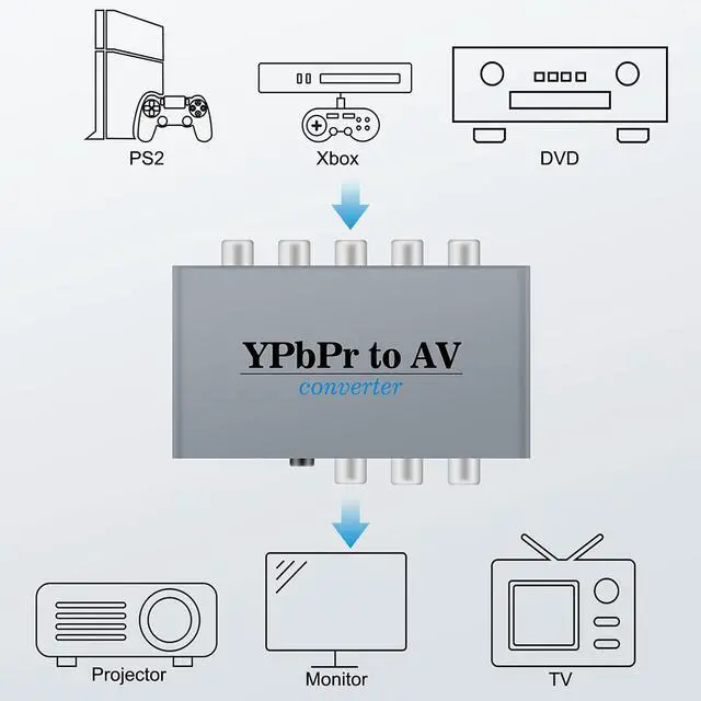 Description: 1080P Component to RCA adapter which is used for converting Component digital signal into RCA (AV, Composite, CVBS) analog signal, So you can play Component source devices on TV/Moniter/Projector which has RCA port.