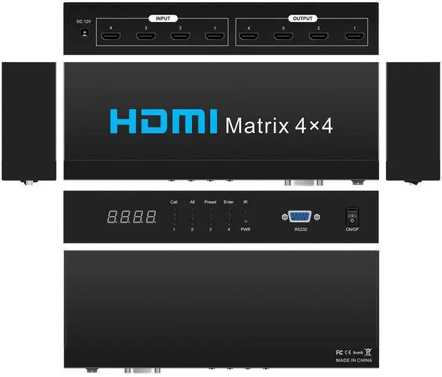 Feathure: This HDMI 4x4 Matrix Switcher with 4 HDMI INPUT and outputNote: RS 232 is reserved function, now our device has not the RS 232 function