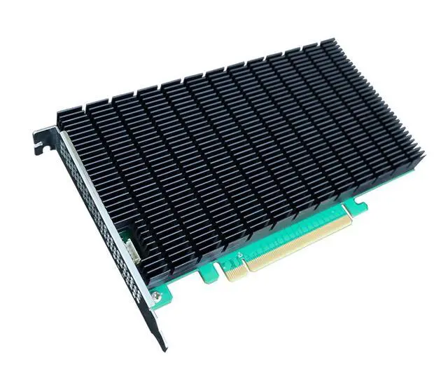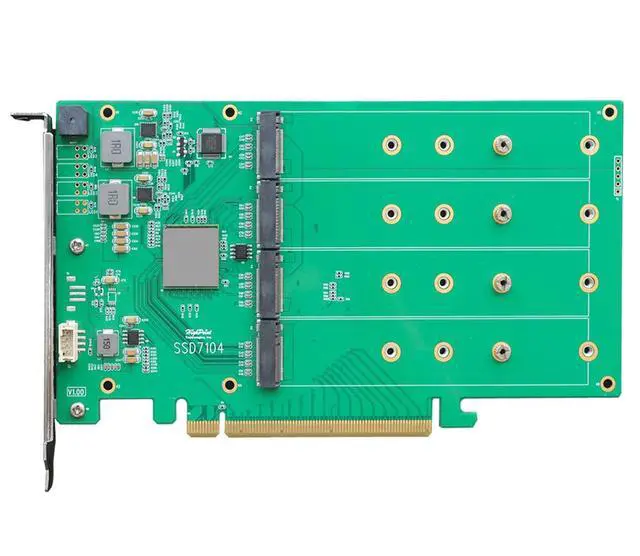 Cooling Solution: The SSD7104 can operate in complete silence, thanks to its full-length black anodized aluminum heat sink and ventilated full-height bracket, which work in conjunction to dissipate waste heat away from critical NVMe chipset componentry and the four hosted M. 2 NVMe SSDs.