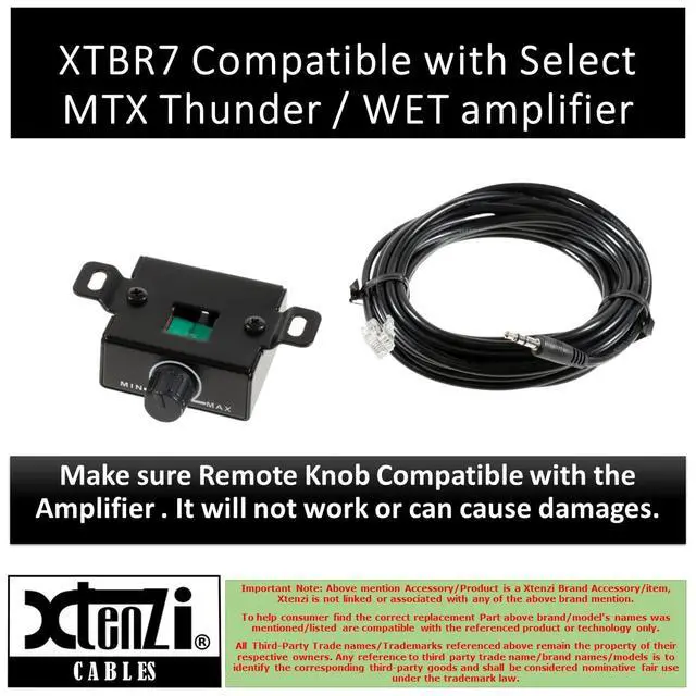 Xtenzi Brand Remote Amplifier Level Controller Optional bass remote XTBR7-91562. ^^ Optional Wired Remote Volume Control Compatible with Select MTX Thunder / WET series Amp. ^^ Controls the bass/gain from the front seat or remote location from amplifiers, without having to reach for the amplifier. ^^ Allows you to adjust your Bass Level quickly and in the Most Ideal Location, easily mounts underneath a dash for an "out-of-sight' install or simple 1-wire connection gets you up and running in a flash. ^^ High Quality Product Remote Unite comes with 5-meter (196 inch) remote connection wire and bass knob.