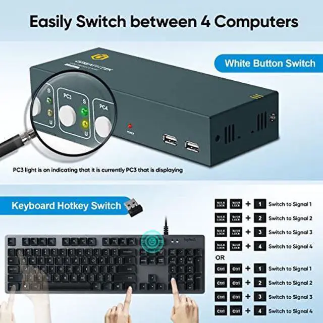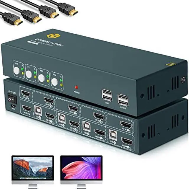 KVM Switch 4 Computers Dual Monitors, 4 Port KVM Switch HDMI 4K@60Hz, KVM Switches USB 2.0, KVM Switch HDMI 4 Port, Button Switch and Hotkey Switch, Plug and Play, KVM Switch 4 Computers 2 Monitors