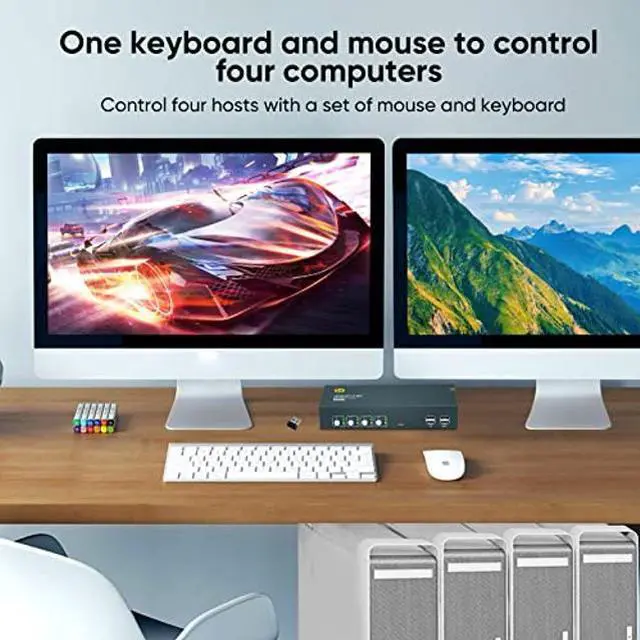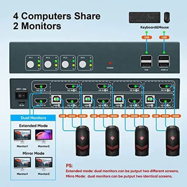 [(KVM Switch 2 monitors 4 computers Meet All Your Needs )] you can control and switch 4 computers freely with just one set of keyboard and Mouse , and share on 2 HDMI monitors ( only available on hosts that support dual display) , which will allows your office ,TV and games needs,etc freely switch . Note: The monitor needs to be set to Extended Display Mode or Duplicate Display Mode. The extended mode can output two different screens, while the duplicate mode can output two identical screens.