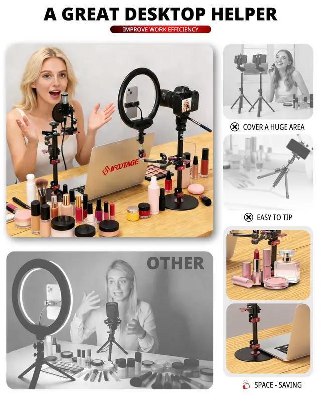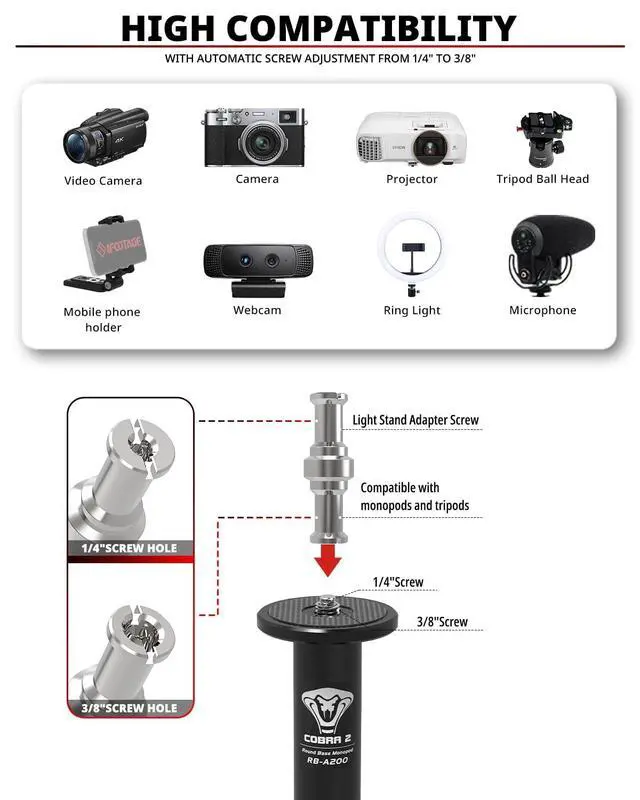 Base Features: Light weight, round base shape is space saving and ideal for use in small spaces such as studios, tabletops. High compatibility, 1/4 & 3/8 conversion screw, very suitable for installing fluid head, monitor, phone holder, mini ball head, microphone, LED light panel and etc.. 1/4" & 3/8" thread adapter for easy installation of video LED Light.