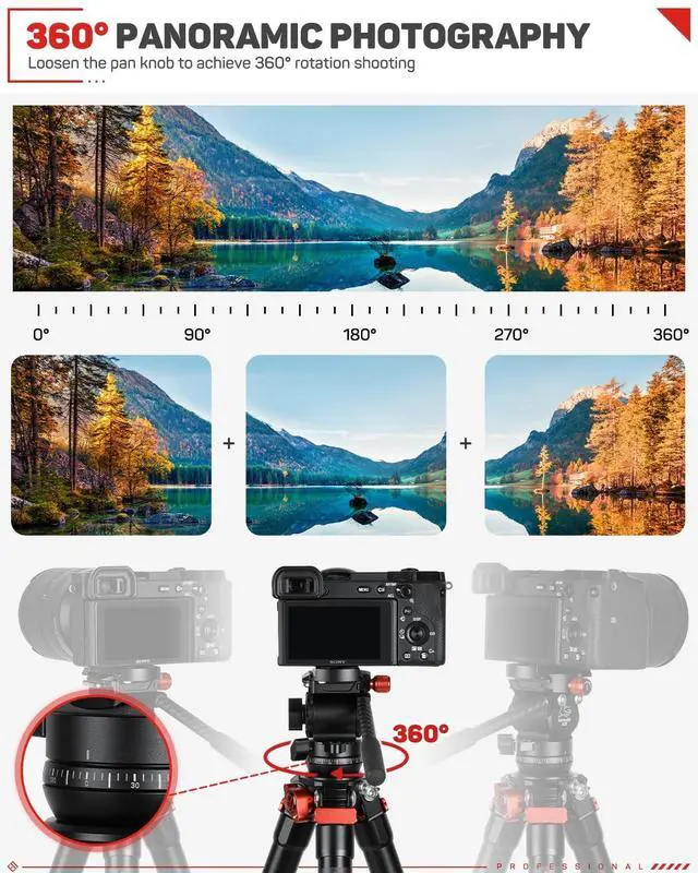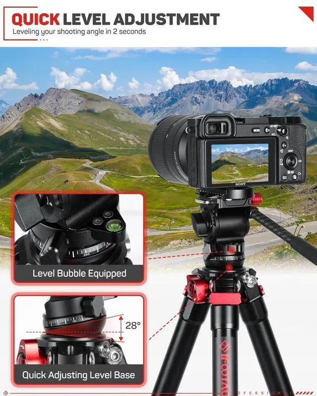 ^^ Quick Level Adjustment: The IFOOTAGE lightweight camera tripod features a flexible leveling base, allowing for smooth swivel of up to 28 in any direction on the go. Additionally, it includes a bubble level for convenient observation and adjustment to the central position. This travel camera tripod enables faster level adjustments, particularly in mountainous, grassy, or uneven terrain. ^^