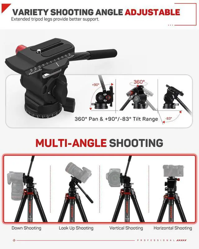 Variety Shooting Angles Adjustable: The head of the IFOOTAGE camera travel tripod is ingeniously designed for flexibility, enabling a 360 horizontal rotation for a broader field of view, along with a wide range of vertical tilt angles from +90 to -83. Whether you're capturing landscapes, architecture, portraits, or any other subjects, this versatile rotation capability assists in capturing the perfect shot. ^^ Telescopic Design for Travel
