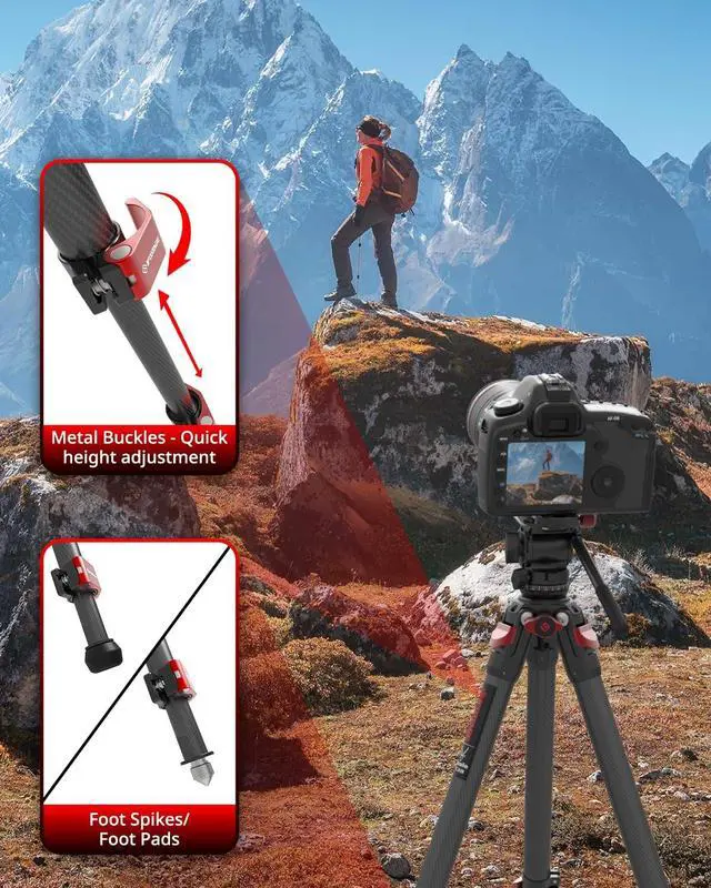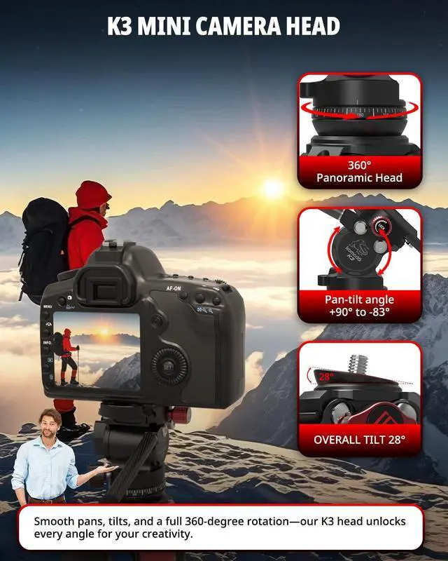 Achieve three preset working heights with precision: 34", 44", and 55", all through a single-motion adjustment process that completes in under 3 seconds. ^^ 360 Adjustable Leveling PlatformThe platform offers 10 of horizontal adjustment range and a 28 tilt capacity. When paired with the K3 gimbal system, it enables extended tilt angles beyond standard specifications, significantly enhancing your cinematographic versatility and creative shooting potential. K3 head tilt angle +90 to -83. ^^ More CompatibilityThis K3 head's quick release plate with standard 1/4 inch screw, which can be applied to most Arca-Swiss quick release plates; 1/4" screw is suitable for most cameras, DSLR camera, projector and telescope, etc. ^^ Hidden hexagonal handleThe magnetic handle is firmly hidden in the K3 head, which can adjust the screws and buckles of the tripod TC3B to avoid loosening due to long-term use of the tripod. ^^ Footpad or SpikesEquipped with integrated foot spikes, eliminating the need for disassembly andaddressing carrying concerns; foot pads and foot spikes can be switched effortlessly.