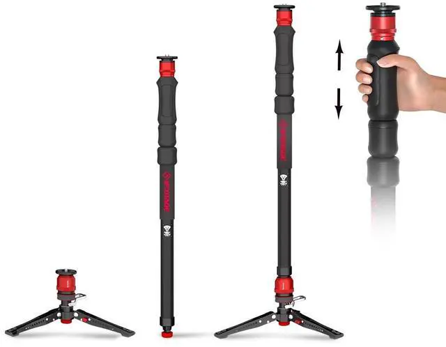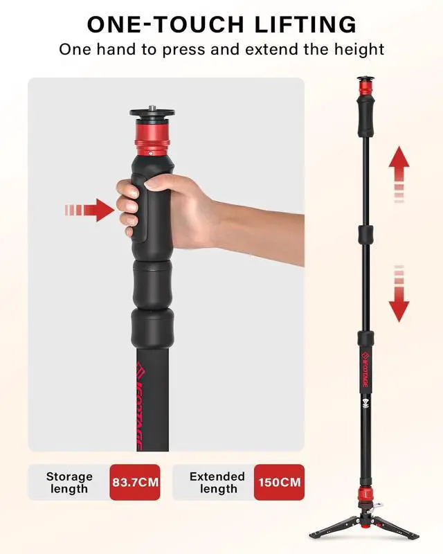 One-touch liftingOne hand to press and extend, the other one free to rest, or even hold other gears. As easy as press and stretch, you can unlock and expand your monopod so you dont miss capturing special moments. ^^ Capture Incredible Moments with Cobra 3 Strike Monopod A150SWith an impressive weight-bearing capacity, this monopod transforms into a reliable trekking stick, offering support and stability on every adventurous terrain. When youre aiming for a low-angle shot or an eye-level shot, you can easily switch it up. ^^ Quick-Release SystemThe top plate and base tripod can be easily removed and installed by pressing down and hearing a click.