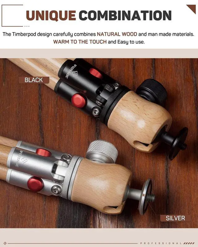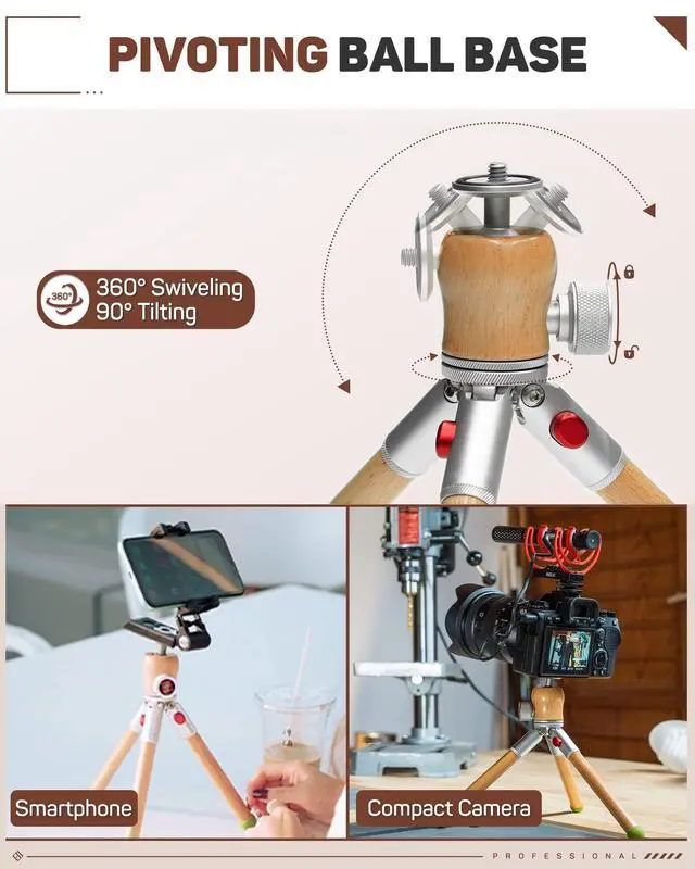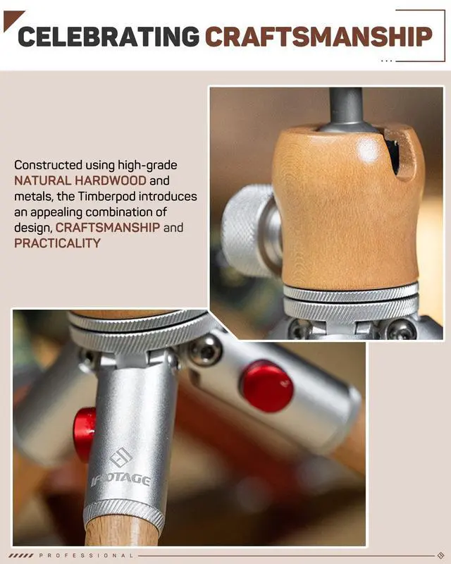 Quintessential Support - The IFOOTAGE timberpod mini tripod has a 1/4"camera screw, 360 rotation locking ball head, 90 tilt function, auto (two position) leg locking adjustment and non skid rubber feet, culminating in an attractive, secure and practical support for cameras, Smartphones, mics, lights or monitors-essential tabletop and studio support for recording, live steaming and vlogging. ^^ Choice of Natural Woods - Our IFOOTAGE small tripod legs are natural hardwoods, treated with a mineral coating which helps prevent fading and allows the wood to continue to breath naturally.