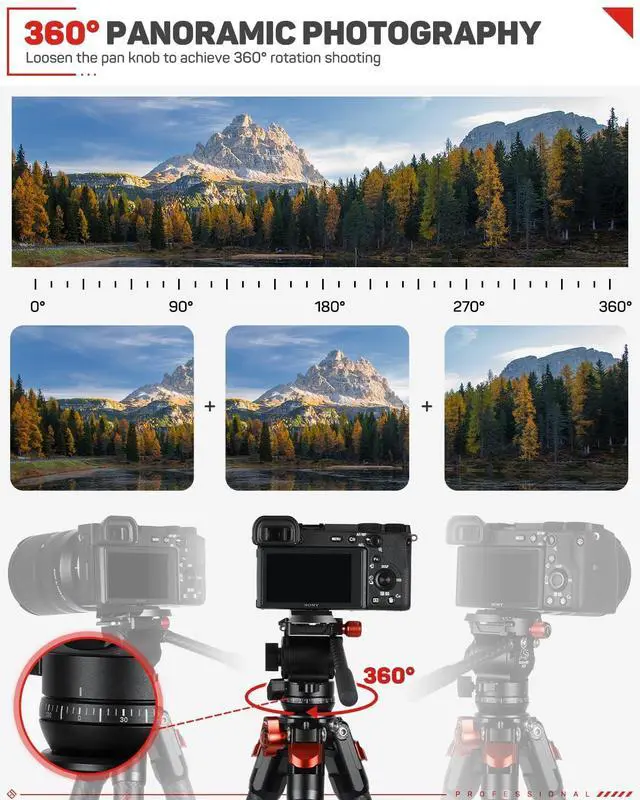 Variety Shooting Angles Adjustable: TC3B camera travel tripod kit features a versatile head design, offering a 360 horizontal rotation for a broader view and a wide range of vertical tilt angles from +90 to -83. Whether you're shooting landscapes, architecture, portraits, or any subjects, this flexibility helps you capture the perfect shot. ^^ Telescopic Design for Travel