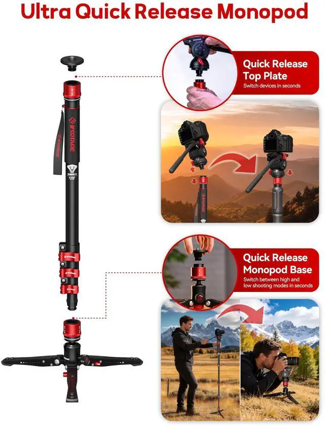iFootage has been re-defining camera support equipments which making photographing more and more easy, fast and innovative! New Released Cobra 3 Series Monopods are upgeaded versions of Cobra 2 Series Monopods, bringing you faster, safer and more convenient experience. FEATURES Patented Quick Release System Detachable Modular Design 1/4" and 3/8" Convertible Screw Versatile 3 in 1DEATAILS